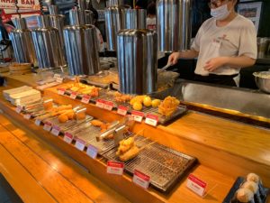 日本の変わらない出汁の効いた美味しそうな匂いがいっぱいのカレーうどんをトレイに乗せ、進んでいくとこれまた魅力的なかき揚げやら揚げたての天ぷらがあり適当に小皿に乗せお会計。