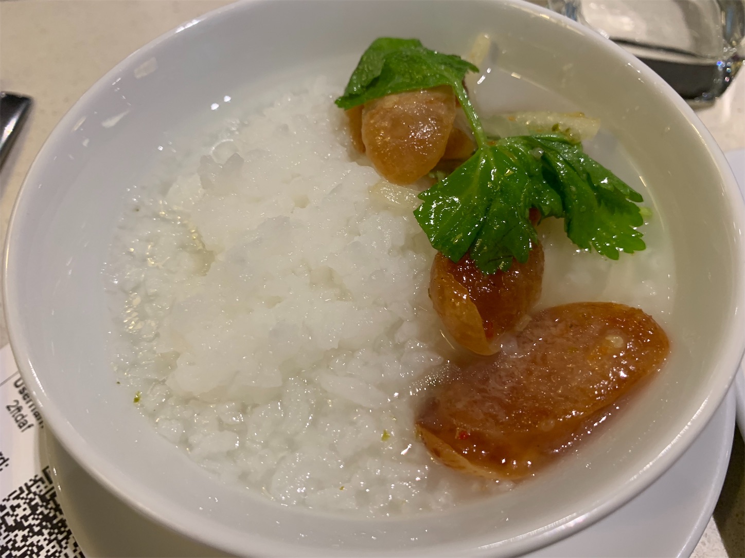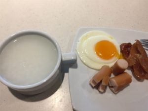 ホットビュッフェにはソーセージとベーコンもあり、その横にお粥のセルフサービスがあり、かなりしっかりとし朝食をいただけます